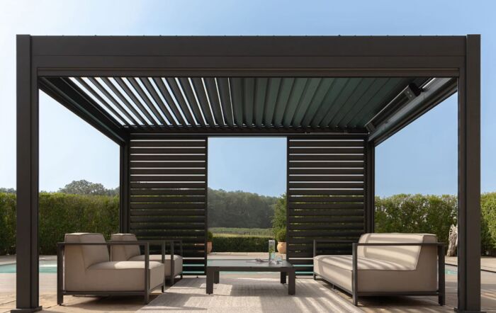 We love the whole idea of this stylish garden pergola. From it's intelligent drainage system and electric louvre roof panels to its intergraded lights which are multi-coloured or white, they even flash!